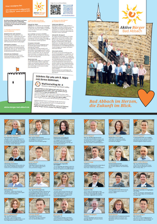 Verschenken Sie keine ihrer Stimmen, indem sie weniger als 24 Stimmen vergeben. Z.B. mit dem Listenkreuz für Liste Nr. 6 (ABBA) stärken Sie uns auf jeden Fall für die nächsten 6 Jahre. Wir sind seit 24 Jahren im Gemeinderat mit mindestens 1 Gemeinderat vertreten.